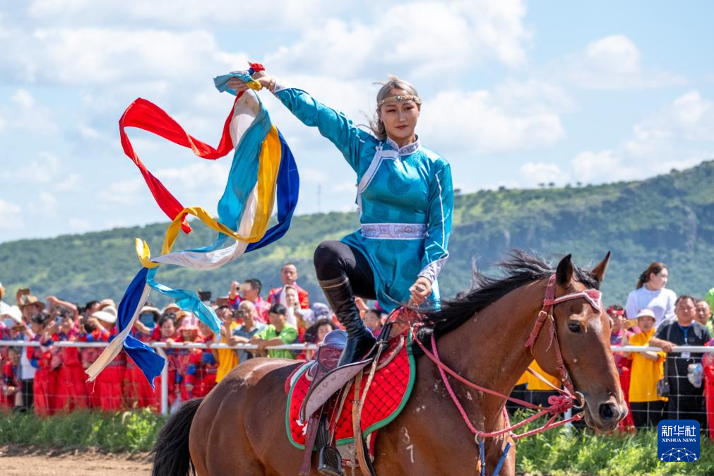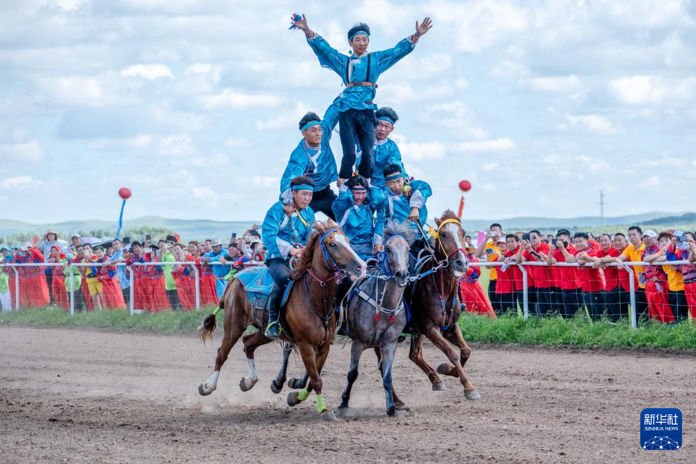 8月7日,演员在农牧民那达慕大会上表演马术。
