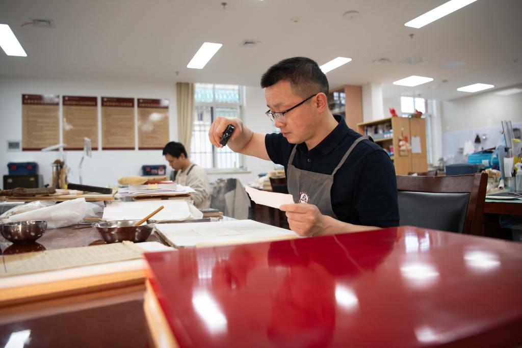 6月24日,在安徽省图书馆内,古籍修复师金鑫查看书叶破损情况。